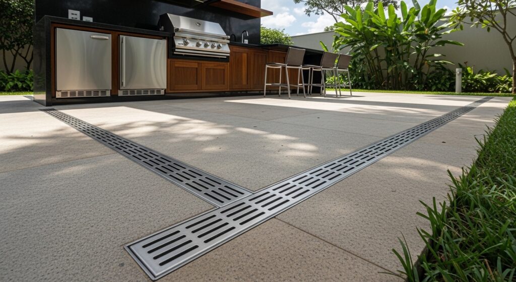 - Espaços gourmet e cozinhas — drenagem eficiente com acabamento inox escovado;